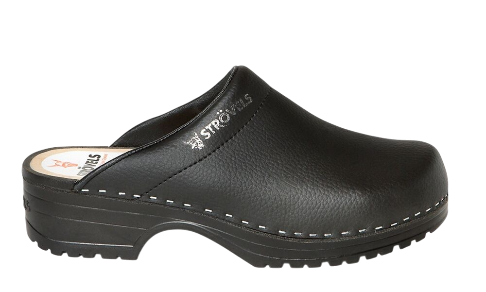 Clog mit offener Ferse, PU-Sohle, Obermaterial und Futter aus Leder.