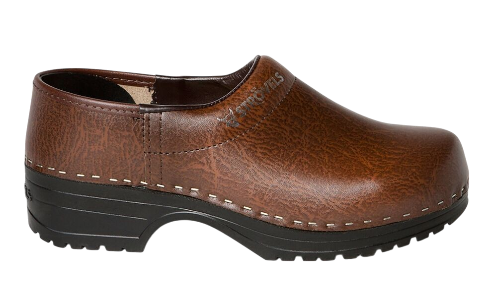 Diese Strövels-Holzschuhe mit Holzfußbett haben ein Obermaterial aus hochwertigem Leder und eine geschlossene Ferse.