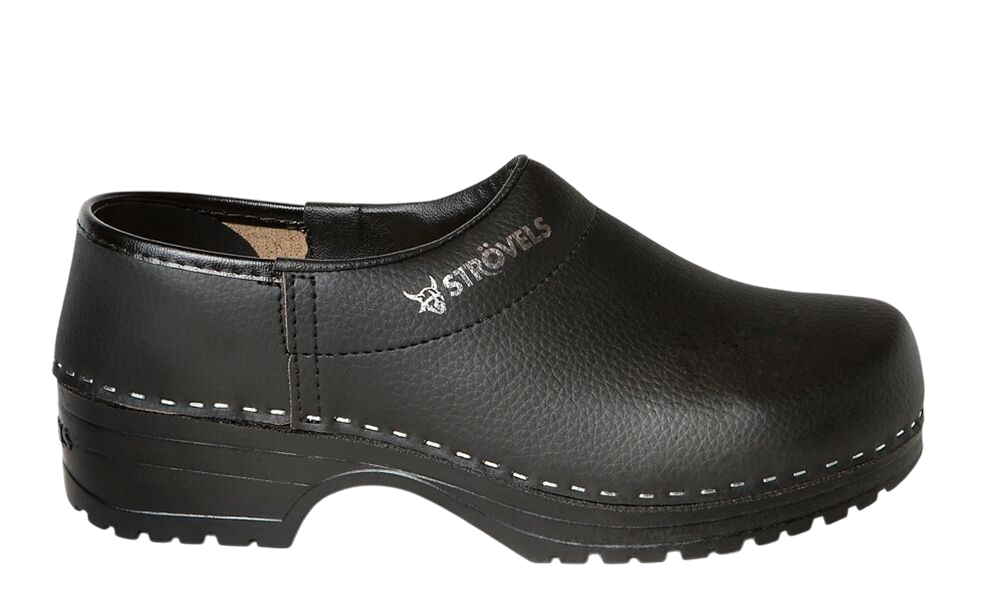 Diese Strövels-Holzschuhe mit Holzfußbett haben ein Obermaterial aus hochwertigem Leder und eine geschlossene Ferse.