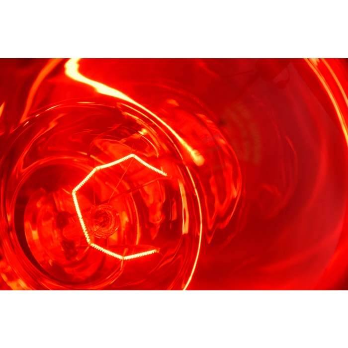 In vergelijk met de helder witte lamp geeft de rode lamp minder fel licht; de infraroodstraling en warmte zijn gelijk.