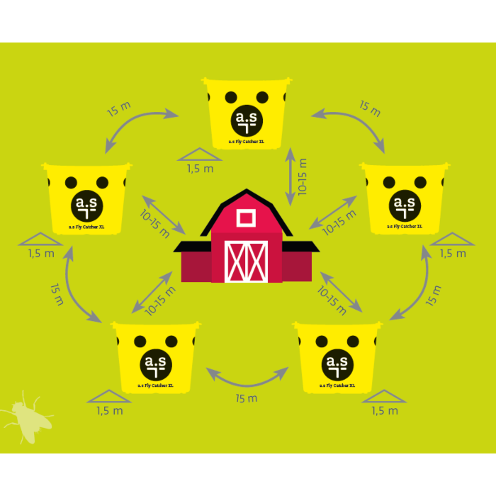 Plaats de emmers buiten op 10-15 meter van de stal, bij voorkeur op 1,5 meter hoogte op een beschutte plek. Het bereik van een vliegenval is ongeveer 200-300 m2. Houdt tussen de verschillende te plaatsen emmers een afstand aan van ongeveer 15 meter.