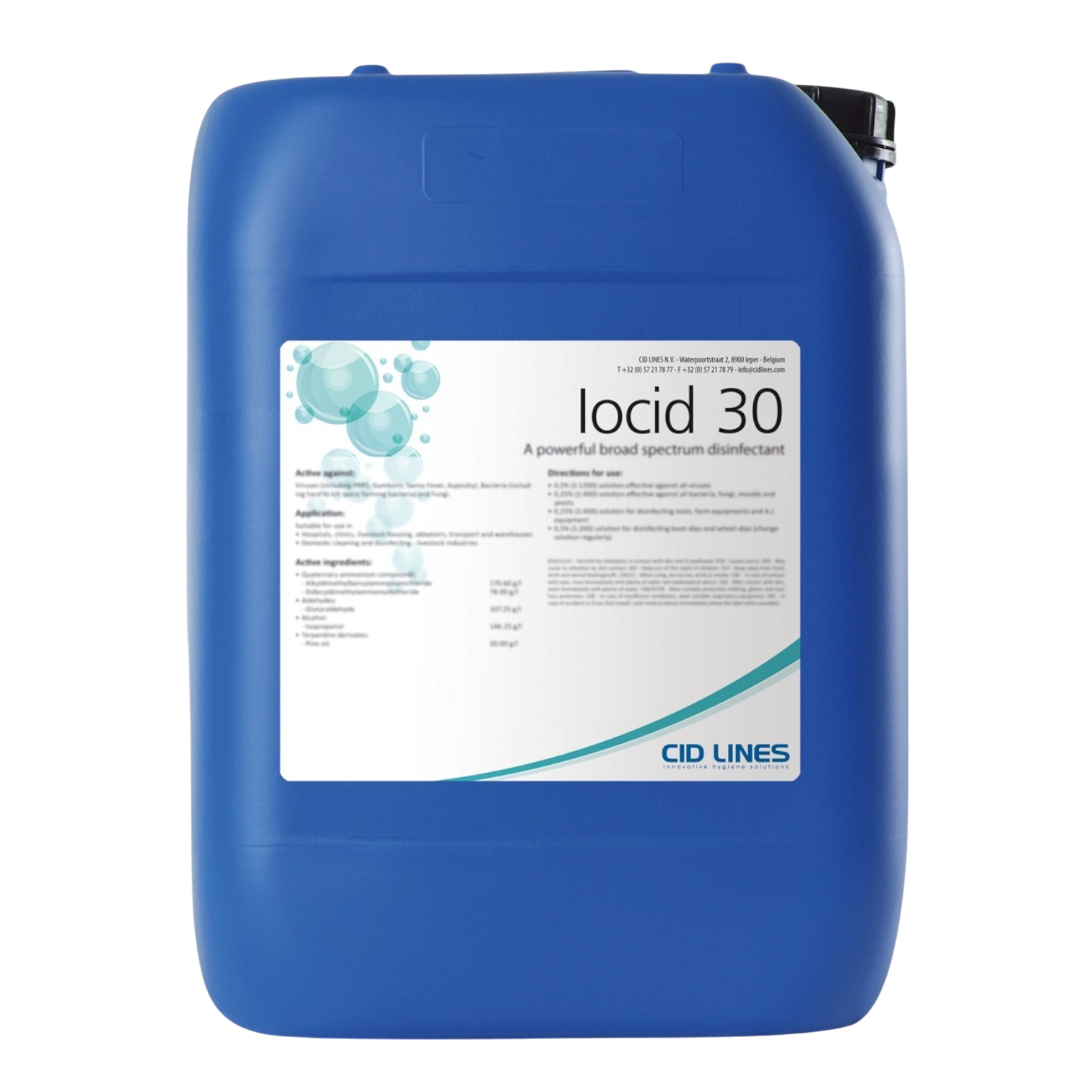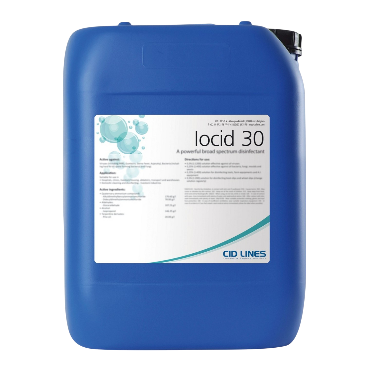 Iocid 30 is een vloeibaar desinfecterend product, ontwikkeld door CID LINES N.V., dat uitblinkt in kracht en effectiviteit. Het product bevat een uniek complex dat zorgt voor een consistent hoog en stabiel jodiumgehalte van 2,8%, waardoor het een zeer betrouwbare desinfectiemethode is. Iocid 30 is ideaal voor de desinfectie van stallen en transportmiddelen voor dieren, en het is effectief tegen zowel Gram+ als Gram- bacteriën en gistachtige schimmels.