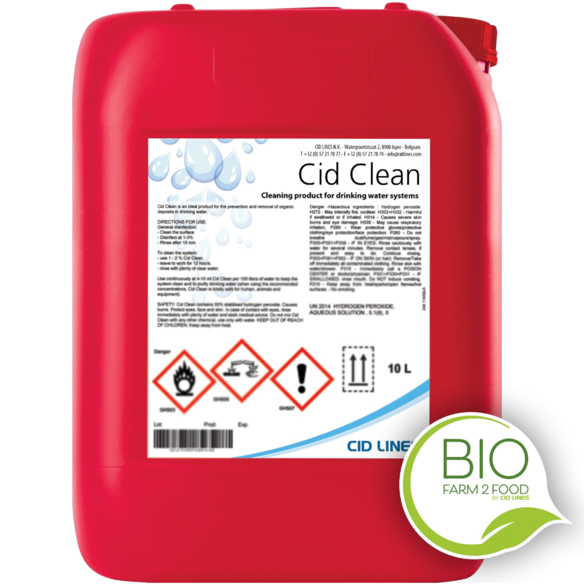 Cid Clean is een reinigingsmiddel gebaseerd op 50% gestabiliseerd waterstofperoxide, speciaal ontwikkeld om te voldoen aan de hoge zuiveringseisen van drinkwatersystemen in stallen. Het verwijdert efficiënt kalk en ijzeraanslag, organische aanslag, en resten van medicijnen en additieven.